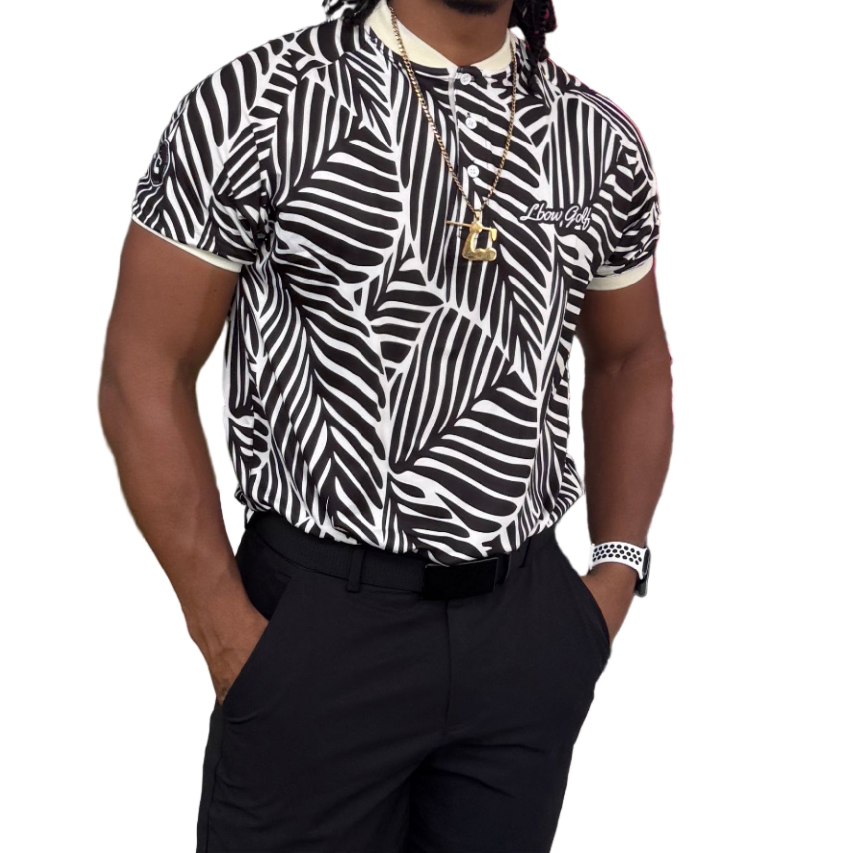 Bring the heat to the fairway with the Black LBOW Tropic Blade Polo. Inspired by the bold shape of banana leaves, this design fuses tropical energy with modern performance.