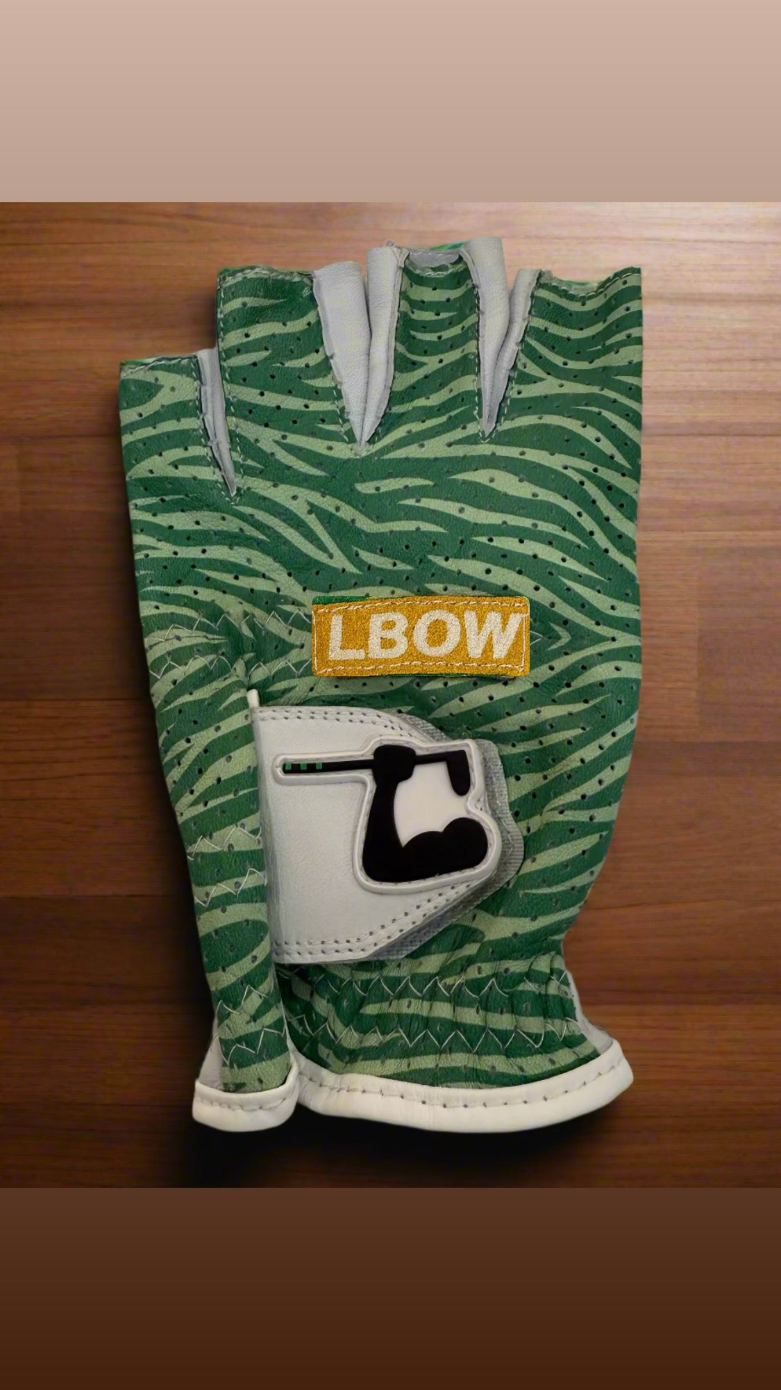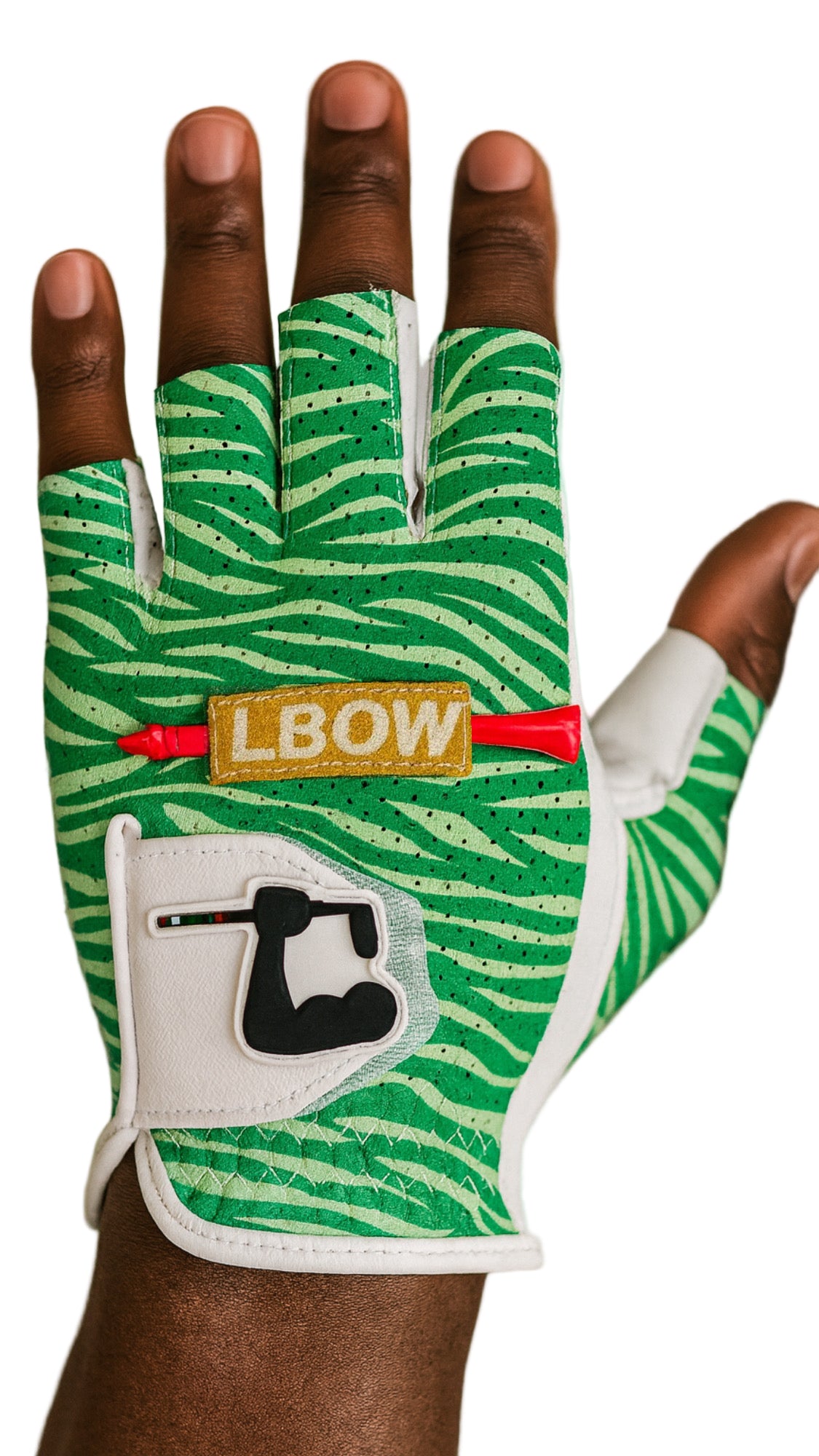Stand out this season with the LBOW Tropic Grip. Featuring a fresh green palm-leaf pattern and breathable perforated fabric, this fingertip golf glove is built for all-day comfort and performance. The soft leather palm ensures a natural grip, while the bold orange LBOW logo brings a tropical vibe to your game.